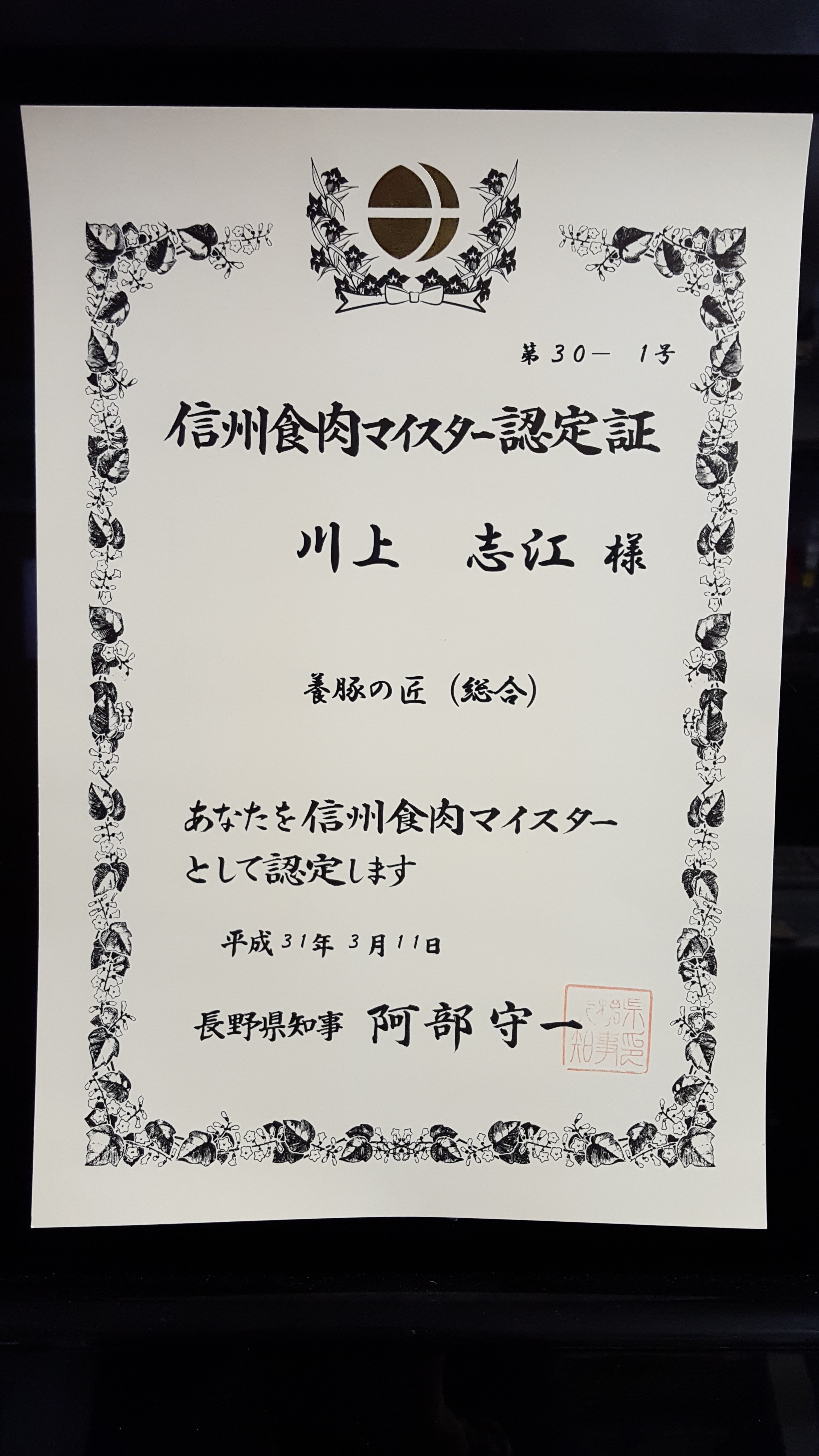 この度、信州食肉マイスターに認定して頂きました!信州食肉マイスターとは、長野県の優れた食肉生産技術を持って高品質食肉を生産している団体を認定する制度です。匠の名に恥じぬよう、これからも高品質な豚肉を安定生産すべく頑張ります!